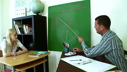 Худенькая девушка сосет массивный член учителя, затем получает его в ее пизду